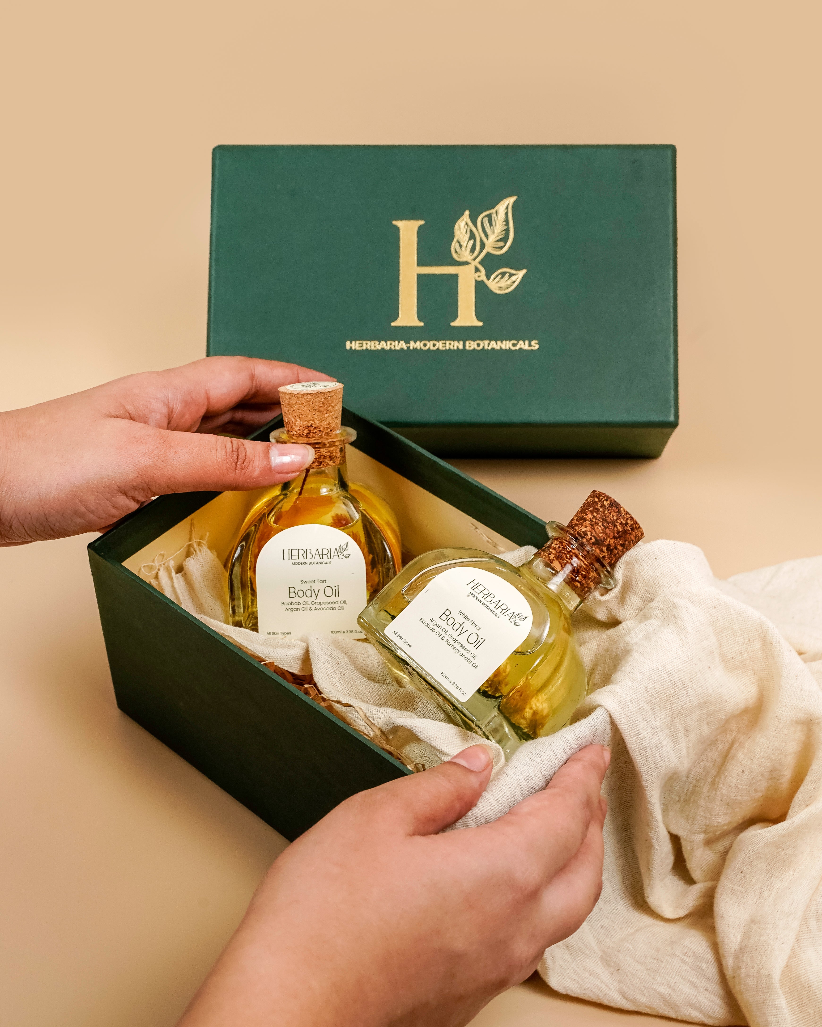 Indulge in the art of timeless elegance with Herbaria’s Velvet Drop Gift Box, a premium body care duo featuring two of our most loved vegan body oils – White Floral Body Oil and Sweet Tart Body Oil. This luxurious pairing is crafted to deeply nourish, soften, and perfume your skin with delicate, lingering scents.