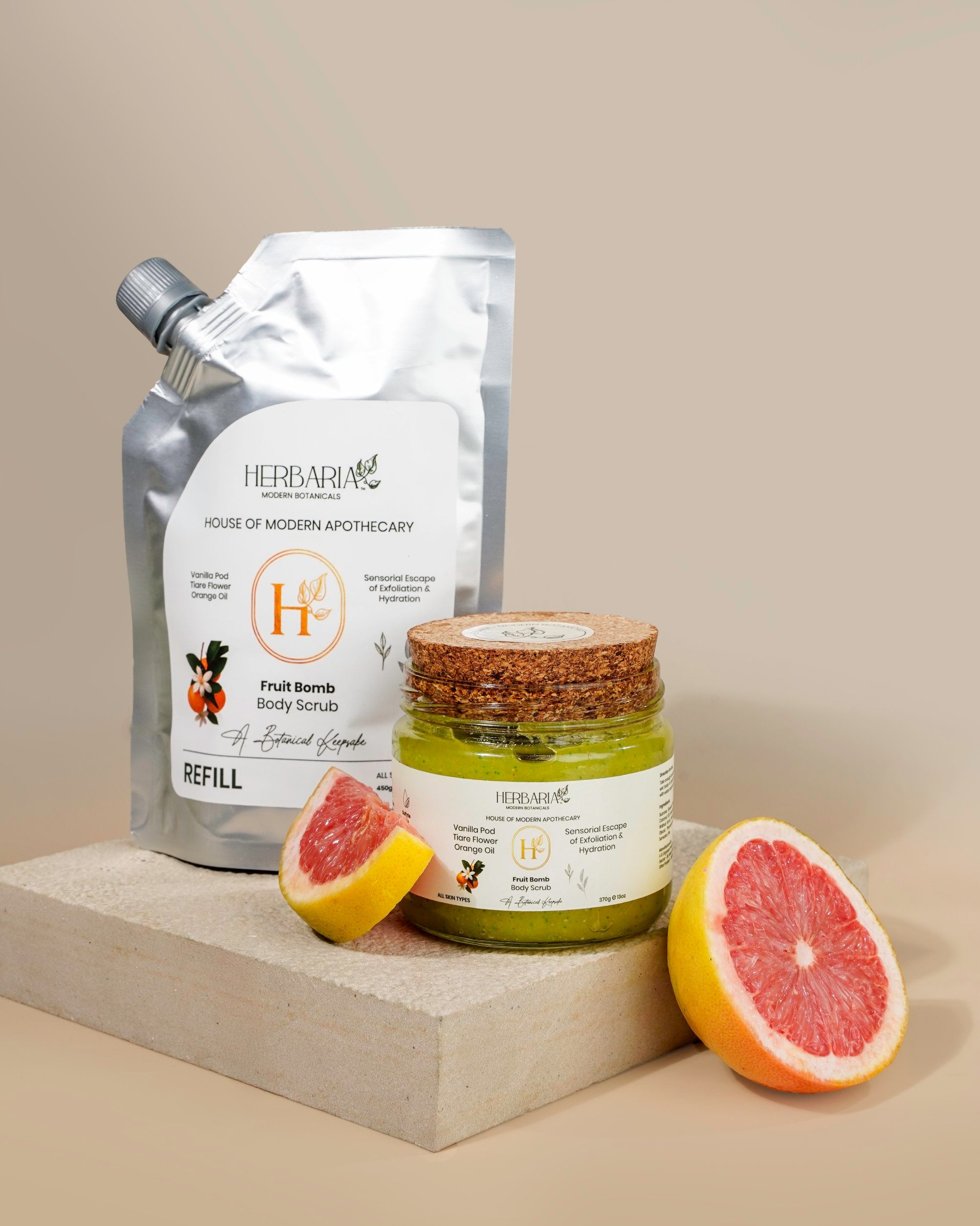Fruit Bomb Body Scrub Let the playful Fruit Bomb Sugar Body Scrub whisk away dull, dead skin cells, revealing a fresh, revitalized complexion underneath with Sugar & Plant based Cellulose Beads. The fine particles work their magic, leaving your skin feeling beautifully polished and radiant.