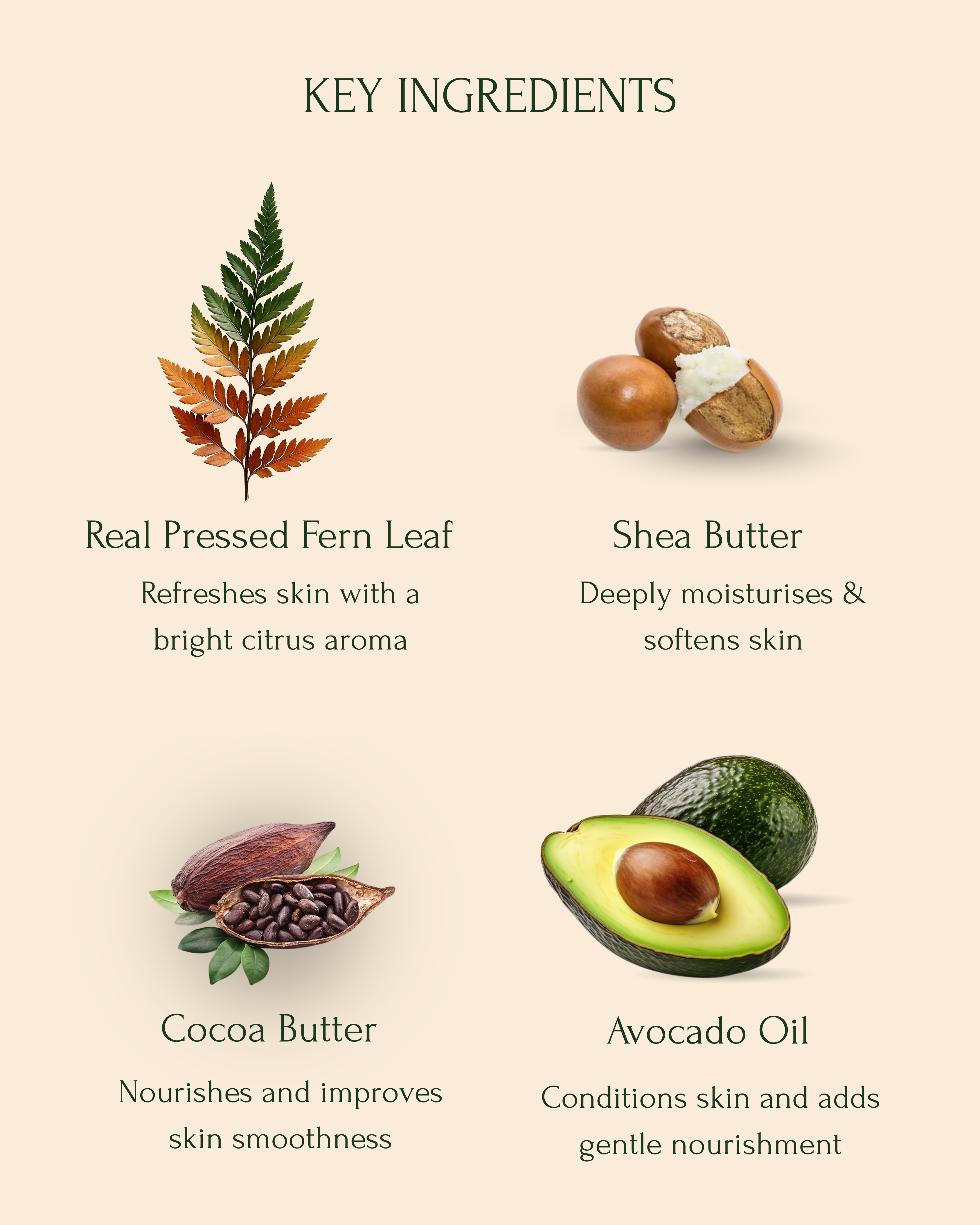 Active Ingredients Shea Butter | Cocoa Butter | Avacado Oil | Dried Fern Leaf