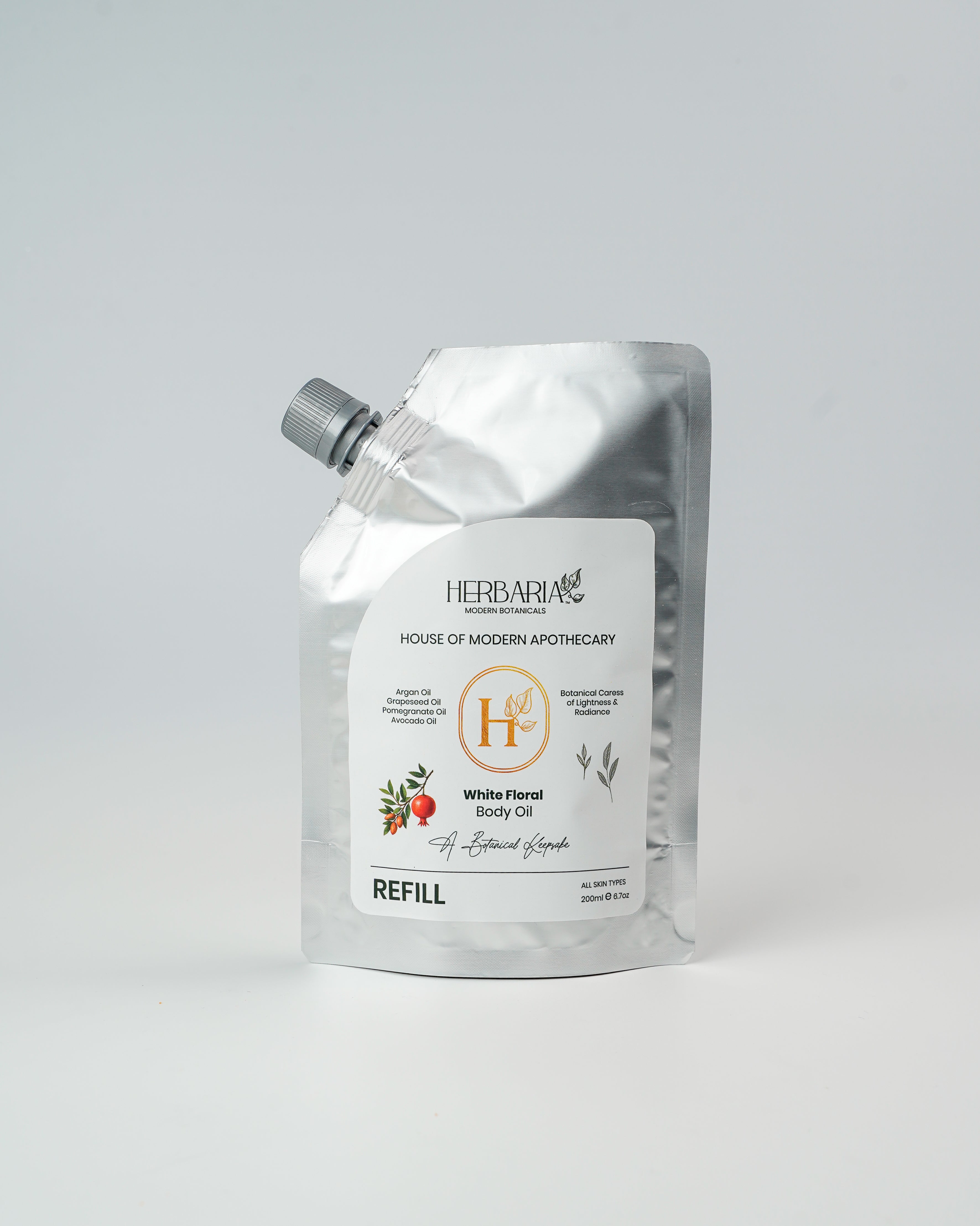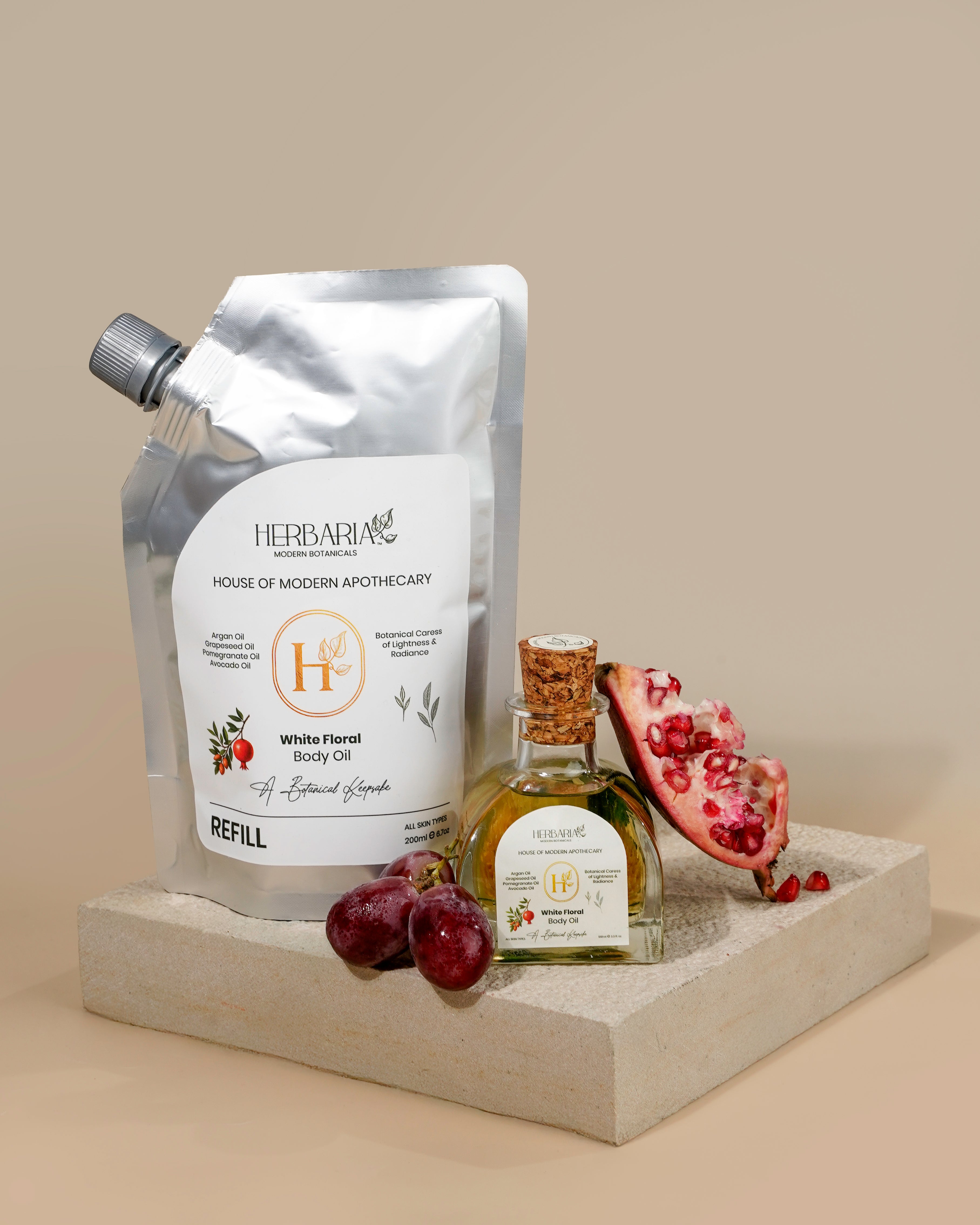 White Floral Body Oil Say Goodbye to greasy body oils. Introducing water- like lightweight White Floral Body Oil especially formulated to provide deep hydration and nourishment. Your summer body care essential with argan and almond oil along with avocados & pomegranates that nourishes without clogging your pores.